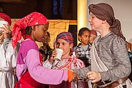 Am Sonntag wurde in der Kirche das Musical "Der barmherzige Samariter" im Rahmen eines Familiengottesdienstes aufgeführt. Corinna Haizmann hatte mit Hilfe ihres Teams das Stück mit (30) Kindern zwischen 6 und 12 Jahren in nur sechs Proben während den Herbstferien einstudiert. In bunten Kostümen, mit eindrücklichen Szenen und mitreißenden Liedern nahmen Chor und Solisten die Zuhörer mit hinein in die biblische Geschichte aus dem Lukasevangelium, in der ein Reisender Opfer eines brutalen Überfalles wird, aber nur einer einfach hilft - während die anderen mit sich oder mit den Tätern beschäftigt sind.